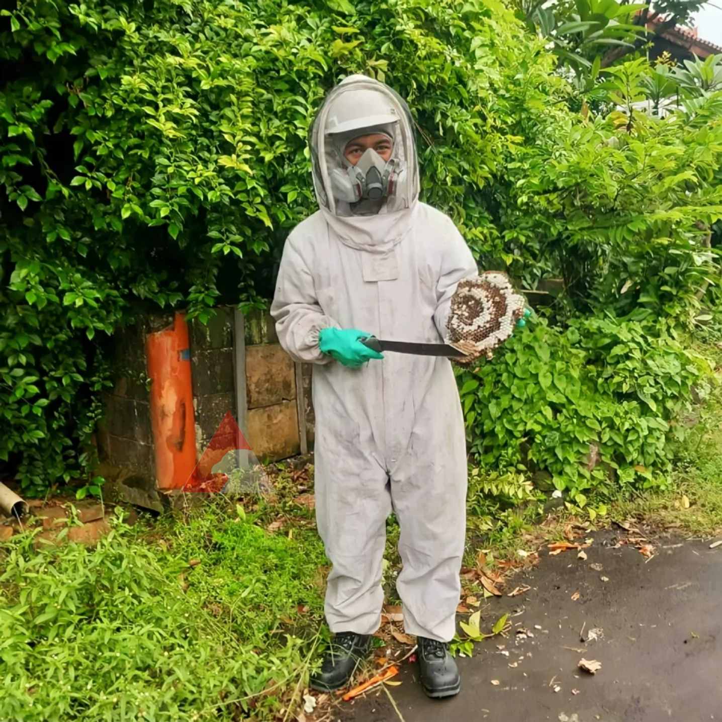 Teknisi kami dilengkapi alat pelindung diri yang lengkap dan sesuai prosedur keselamatan dalam pembasmian sarang tawon.
